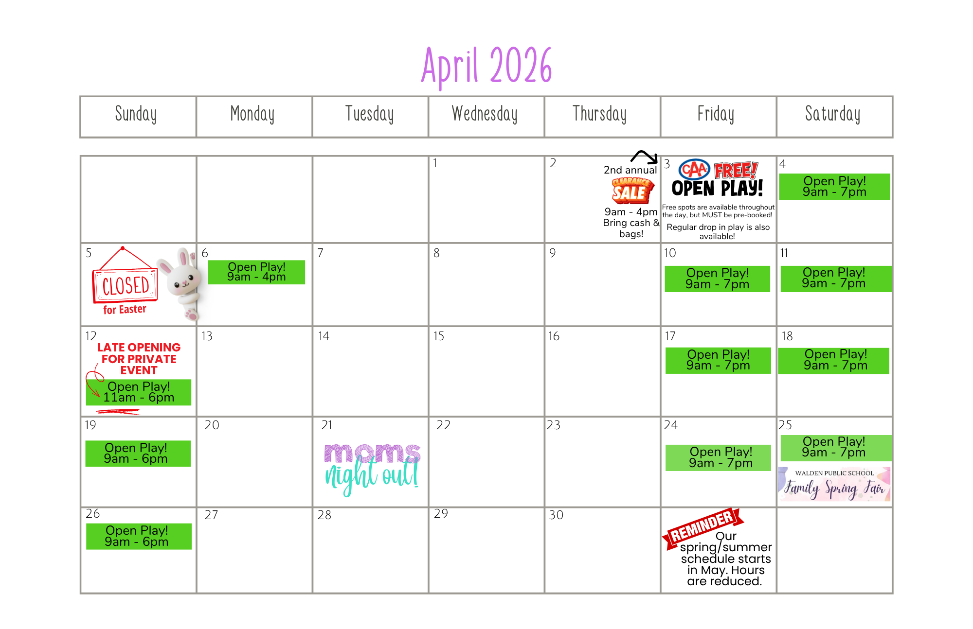 Please note: The last admission to open play is 45 minutes before closing time.