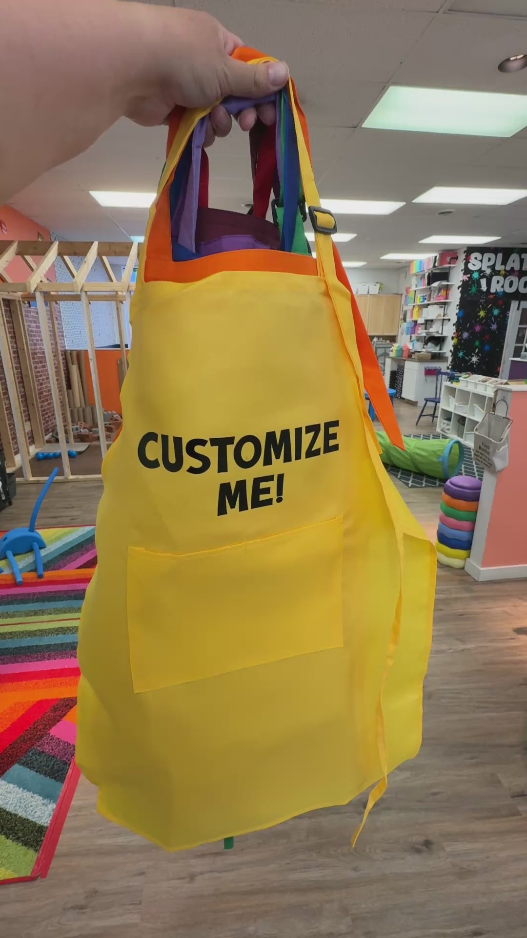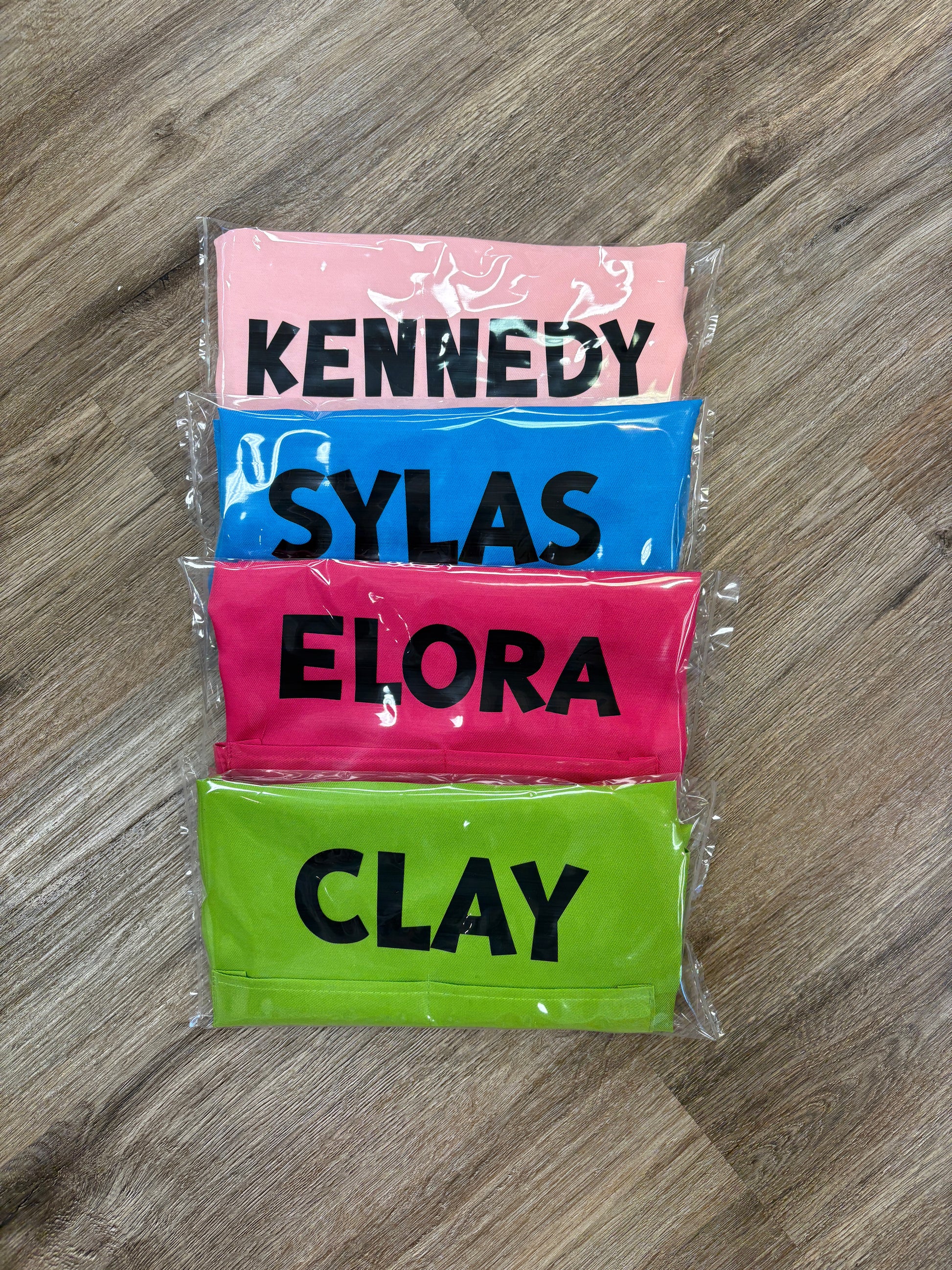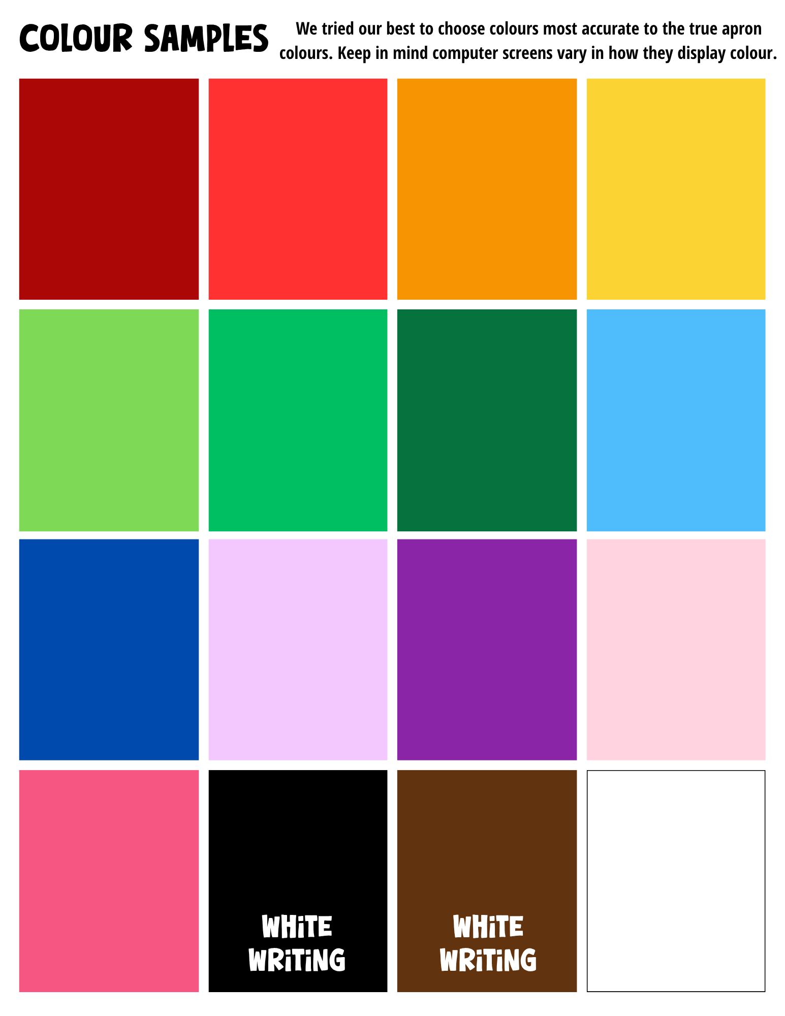 Apron colours are chosen at random and each order will have a variety of colours. If you need all the same colour aprons, please note that turnaround time may be longer and there may be an additional cost.