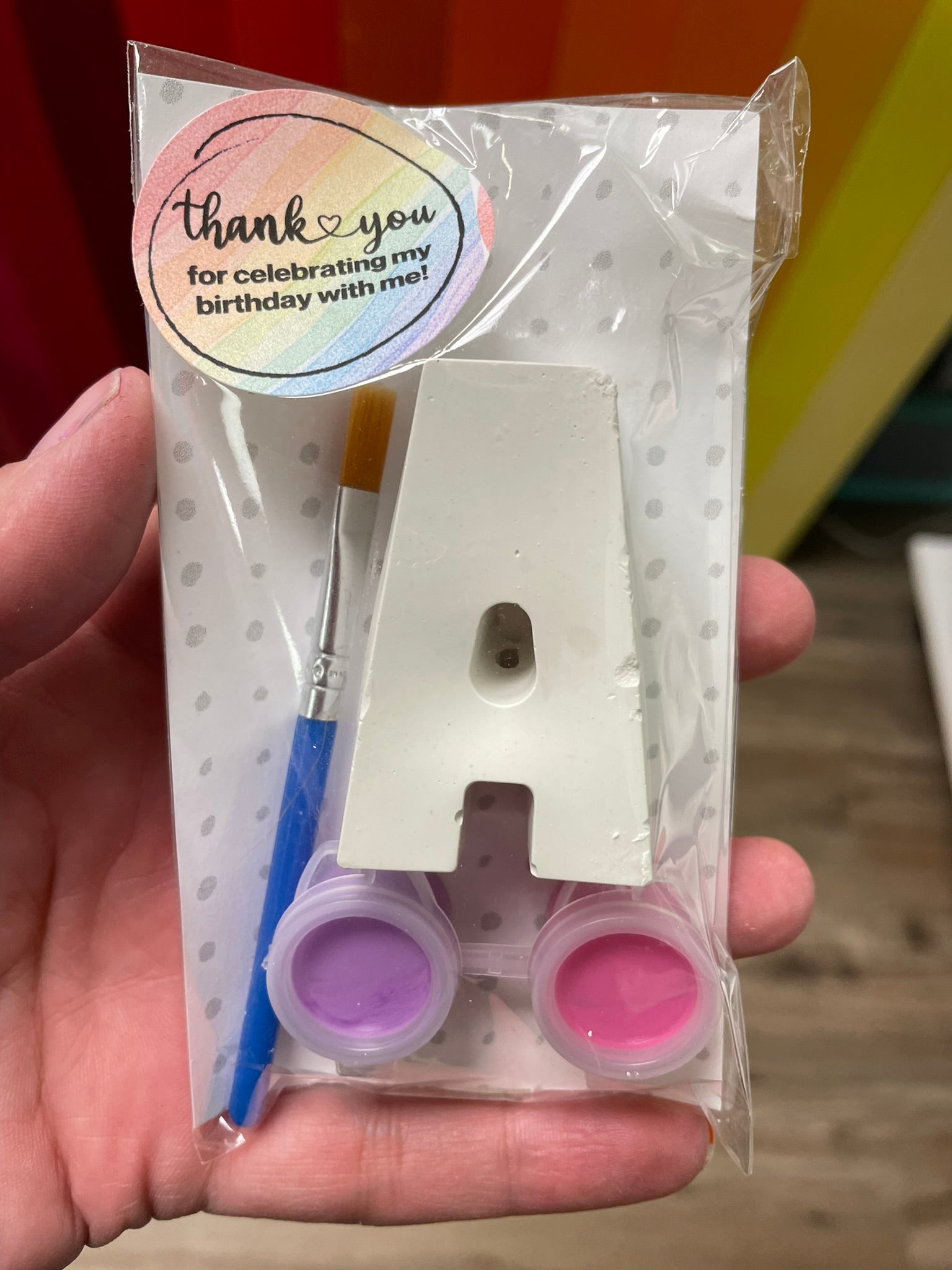 This makes addition to a favour treat bag! Each package includes 1 plaster letter, 2 paint pots, 1 paint brush and a 'thank you' sticker. Paint colours are chosen randomly.