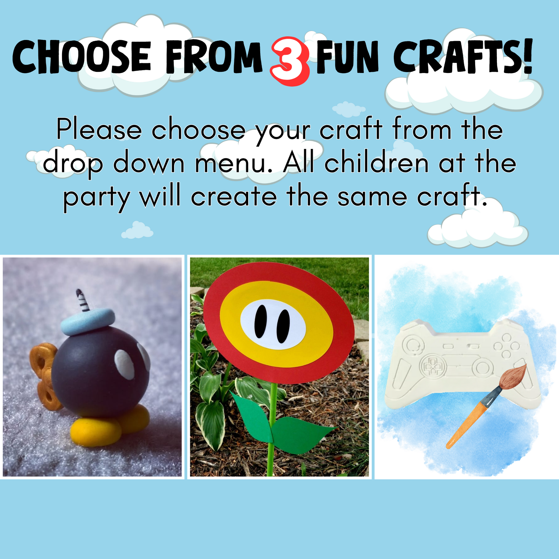 Get ready to jump into a world of fun at our Level Up! party. Kids will be treated to a video game themed party room complete with decor including mushrooms, green pipes, gold coins and more! Choose from 3 fun themed crafts for the kids to create while they're here!