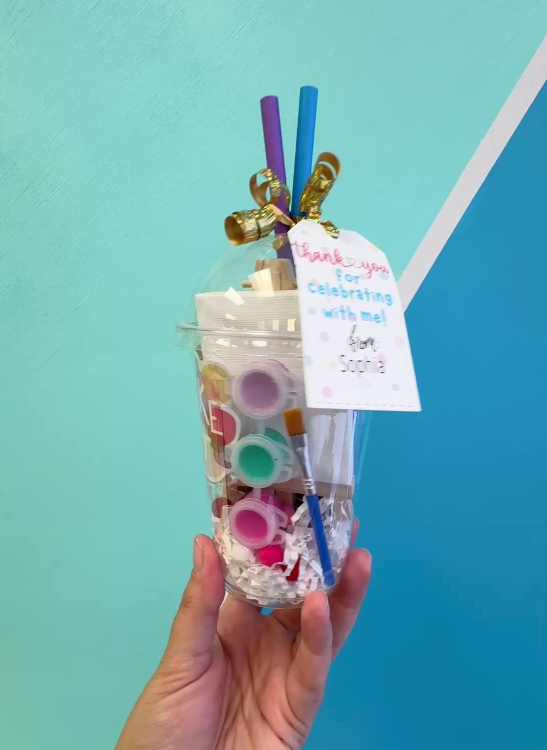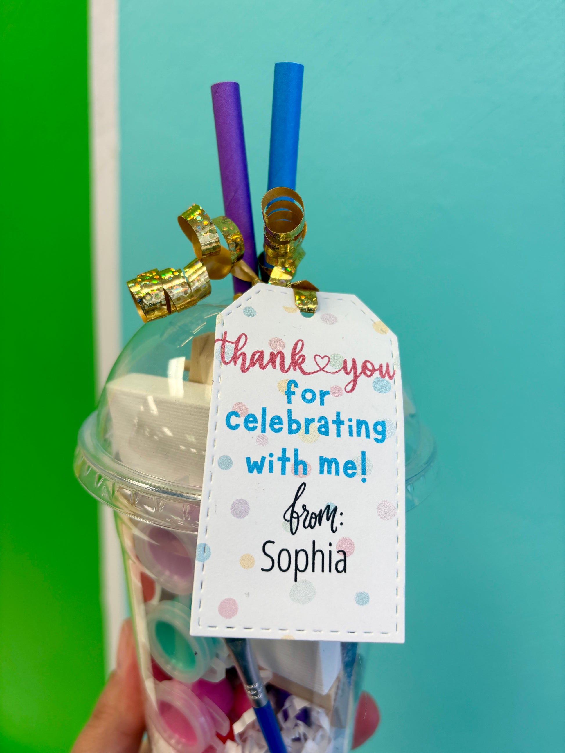 An art project..in a cup! Kids will love these fun cups that are filled with materials to create with! Topped off with 2 paper straws and a thank you tag, these make the perfect party favour!
